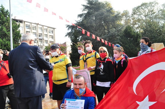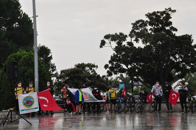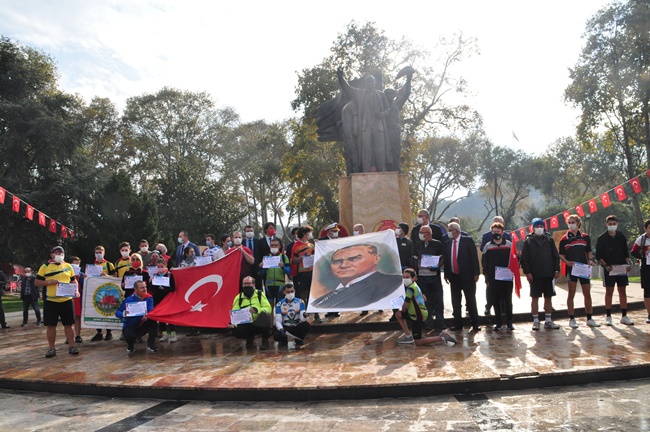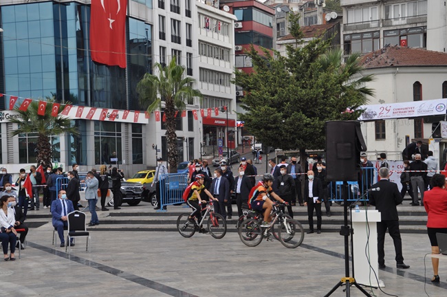 Tören öncesinde, Karadeniz Ereğli Belediyesi’nin ses sistemiyle donatılmış kamyoneti eşliğinde Cumhuriyet Turu yapan ilçedeki bisiklet dernek ve kulüplerine mensup bisikletliler alana girerek yerlerini aldı.