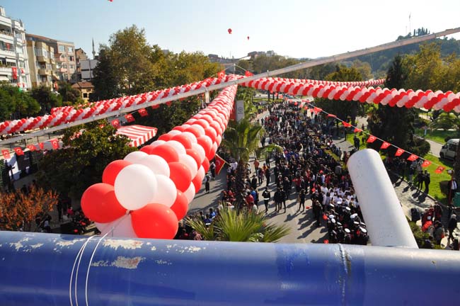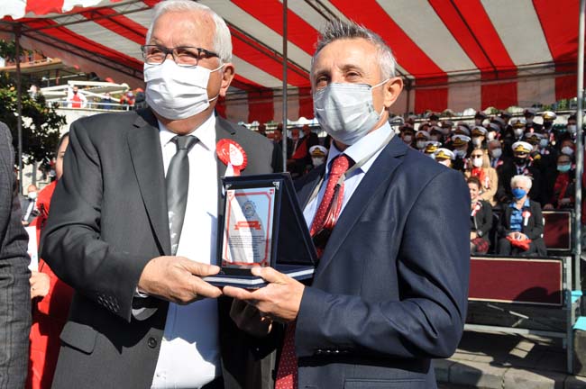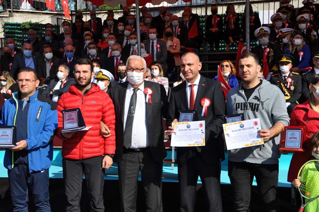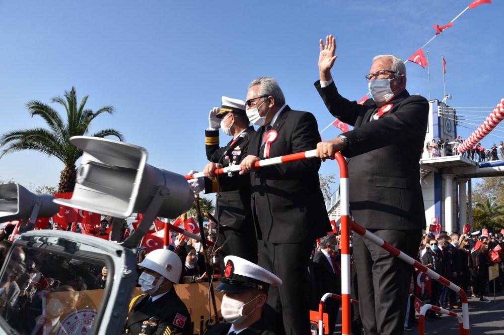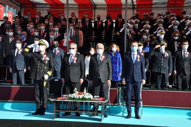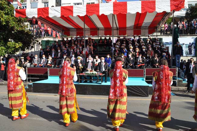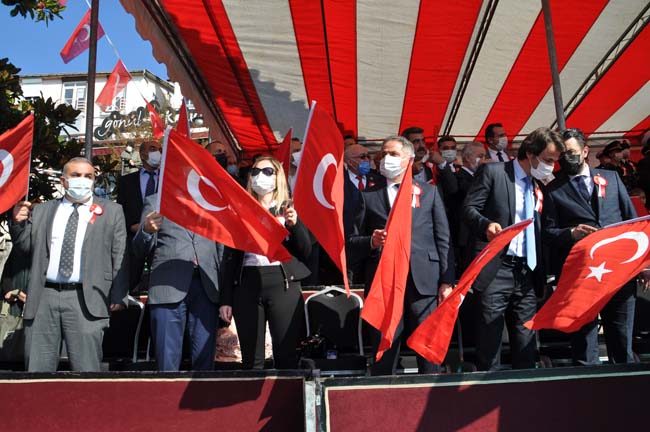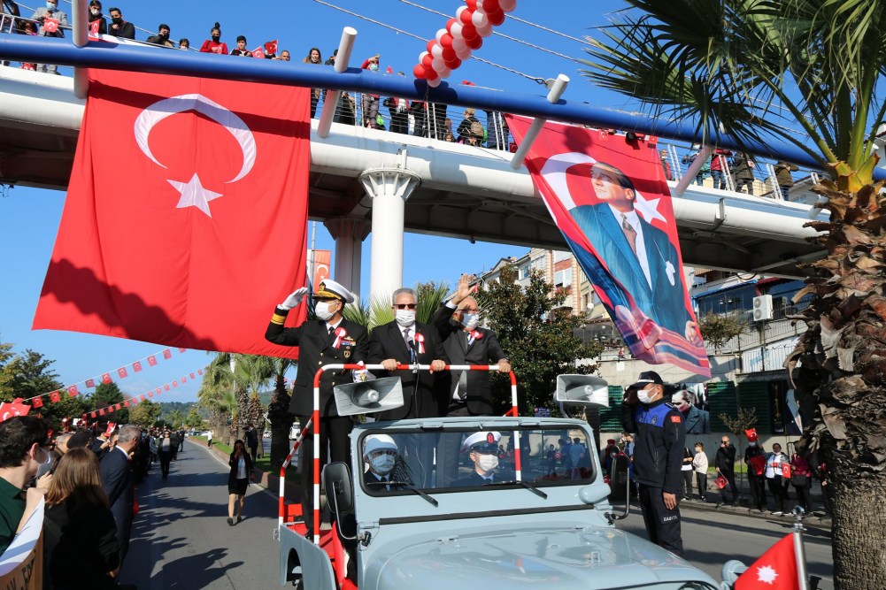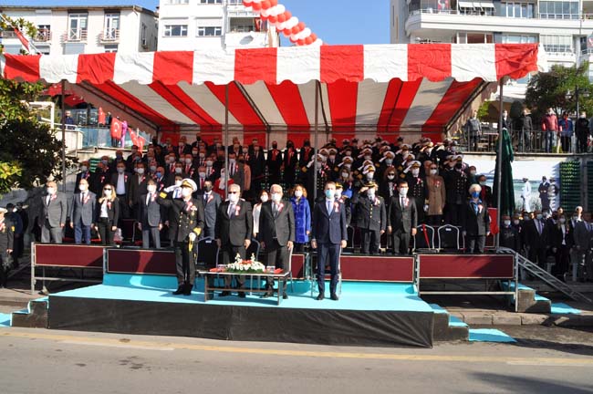 Karadeniz Ereğli Kaymakamı Mehmet Yapıcı, Karadeniz Bölge ve Garnizon Komutanı Tuğamiral Niyazi Uğur, Ereğli Belediye Başkanı Halil Posbıyık tören alanında Atatürk Bulvarında, askeri araç üstünde halkın bayramını kutladılar.