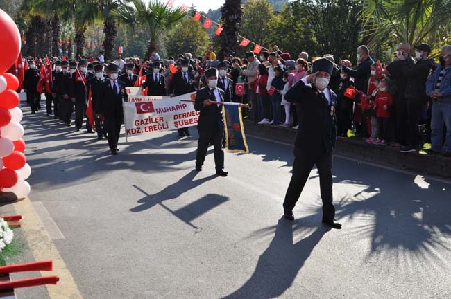 Türkiye Büyük Millet Meclisi’nin 1923'te Cumhuriyet yönetimi ilan etmesi anısına, yurtta olduğu gibi Karadeniz Ereğli’de de 29 Ekim Cumhuriyet Bayramı dolayısı tören gerçekleştirildi. Dün, Atatürk Anıtı’ndaki çelenk sunma töreniyle başlayan kutlamalar bugün, Kaymakam Mehmet Yapıcı'nın Kaymakamlık makamında tebrikleri kabul etmesinin ardından Atatürk Bulvarı’nda tören geçişi ile devam etti.