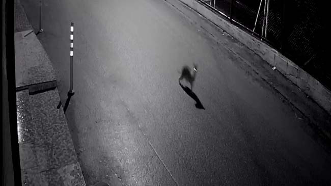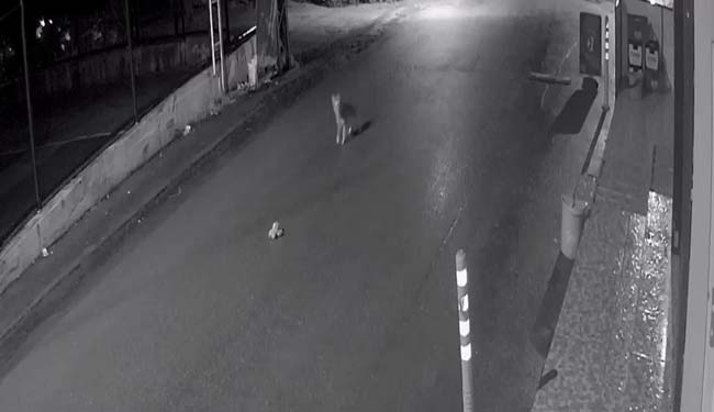Zonguldak'ta aç kalan bir çakal, gece saatlerinde avladığı kediyle ilerlerken güvenlik kamerasına yakalandı.
