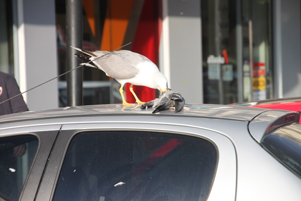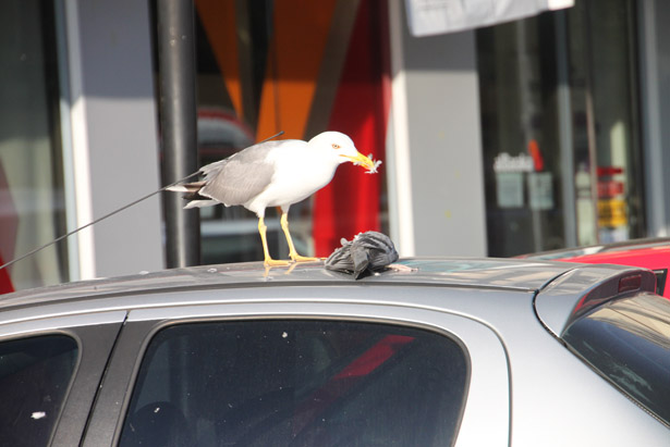 Zonguldak'ın Ereğli ilçesinde aç kalan Martı, şehrin göbeğinde yakaladığı güvercini bir otomobilin tavanında parçalayarak yedi. Bazı vatandaşlar olayı görmemezlikten gelirken, bazıları da martının güvercini yemesini hayretle izlerken "Ben bunlara simit vermiştim. Ama bunlar etcilmiş' diyerek şaşkınlığını gizleyemedi.