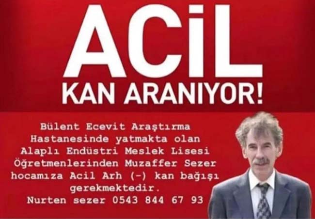 Zonguldak Bülent Ecevit Üniversitesi Araştırma Hastanesi’nde yatmakta olan Alaplı Endüstri Meslek Lisesi öğretmenlerinden Muzaffer Sezer için acil A rh - (negatif) kana ihtiyaç vardır.