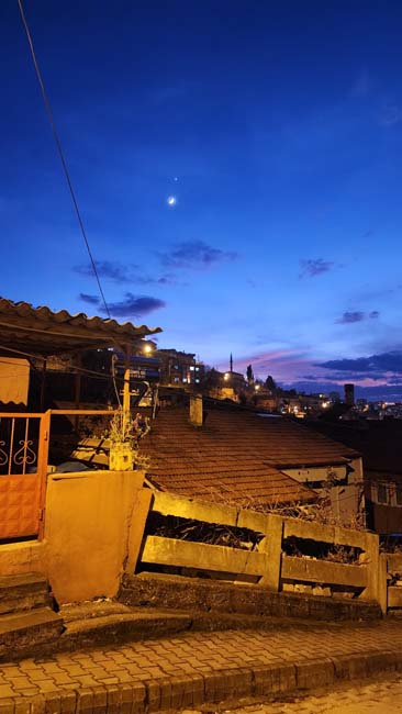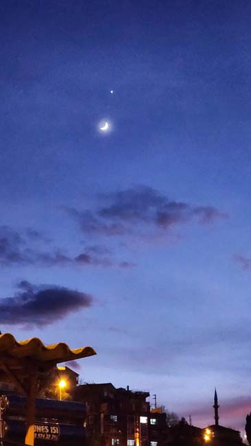 Hilal şeklindeki Ay ile Venüs gezegeni, Zonguldak semalarında aynı anda gözlemlenerek muhteşem bir görüntü oluşturdu. Gökyüzünde Ay'ın ince hilal formunun hemen üzerinde parlayan Venüs gezegeni, izleyenlerin büyük beğenisini kazandı. Doğa tutkunları ve gökyüzü gözlemcileri bu eşsiz anı hayranlıkla izlerken, bazıları bu anı ölümsüzleştirmek için fotoğraf makineleri ve telefonlarıyla görüntü aldı. Göz alıcı manzara, gece boyunca gökyüzüne bakan herkese adeta bir görsel şölen sundu.