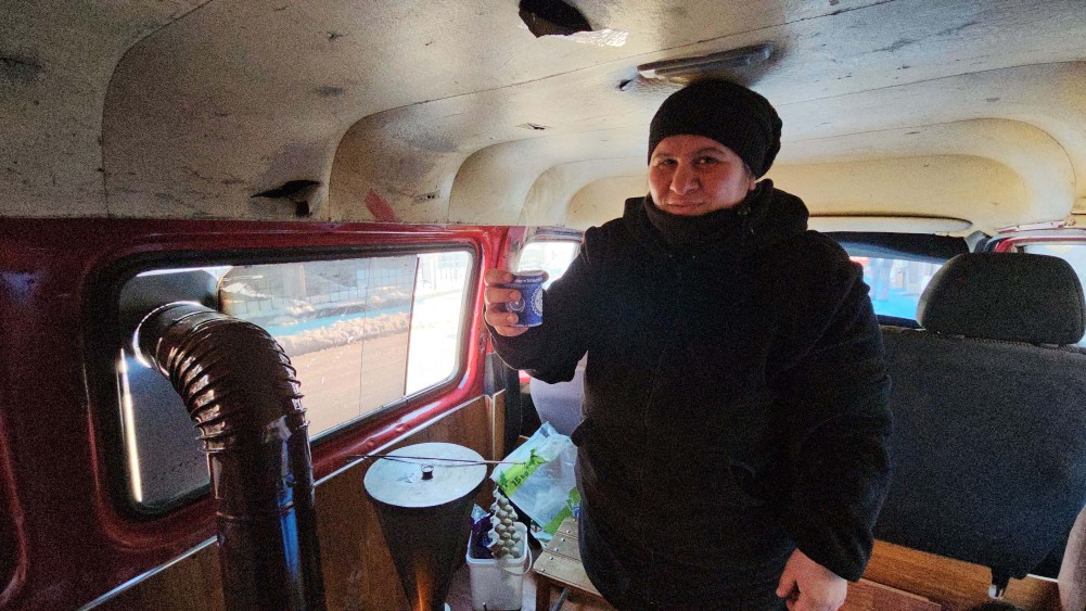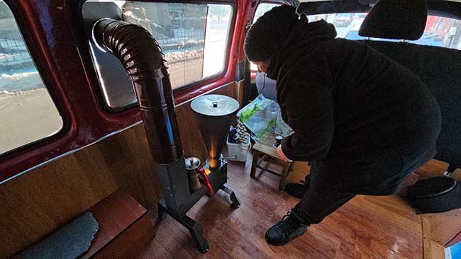 Zonguldak’ta esnaflık yapan Ayşe ve Rıza Demir çiftinin soğuk havada iş yerinin önündeki minibüse kurdukları soba vatandaşların ilgi odağı oldu.