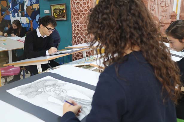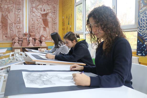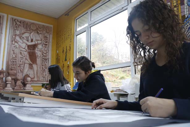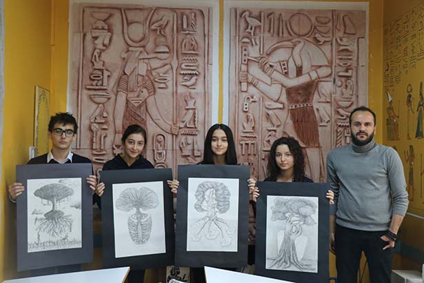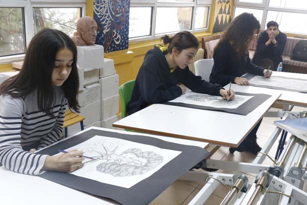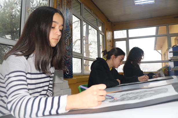Lisesi'nde karakalem yöntemiyle eserlerini tamamlayan öğrenciler, eserlerinin