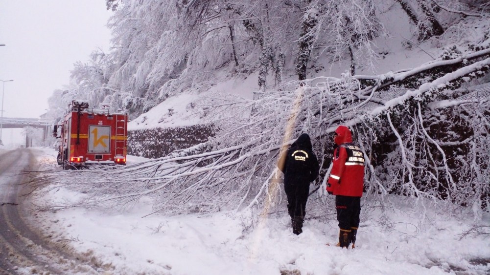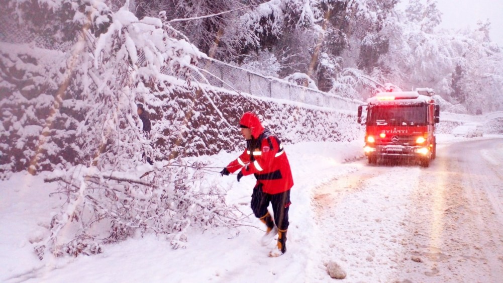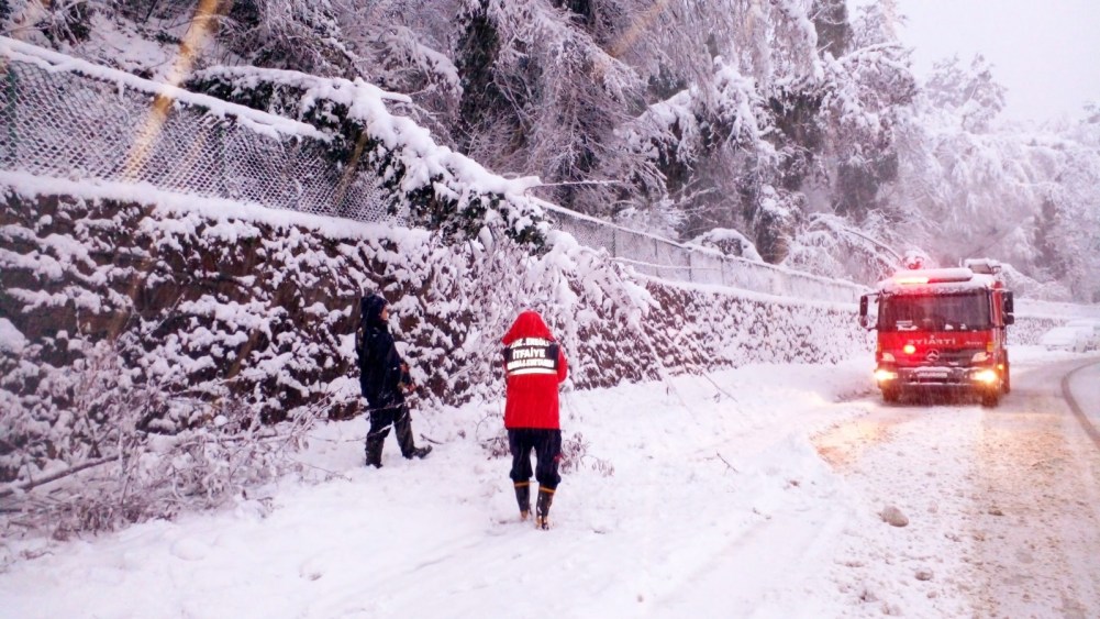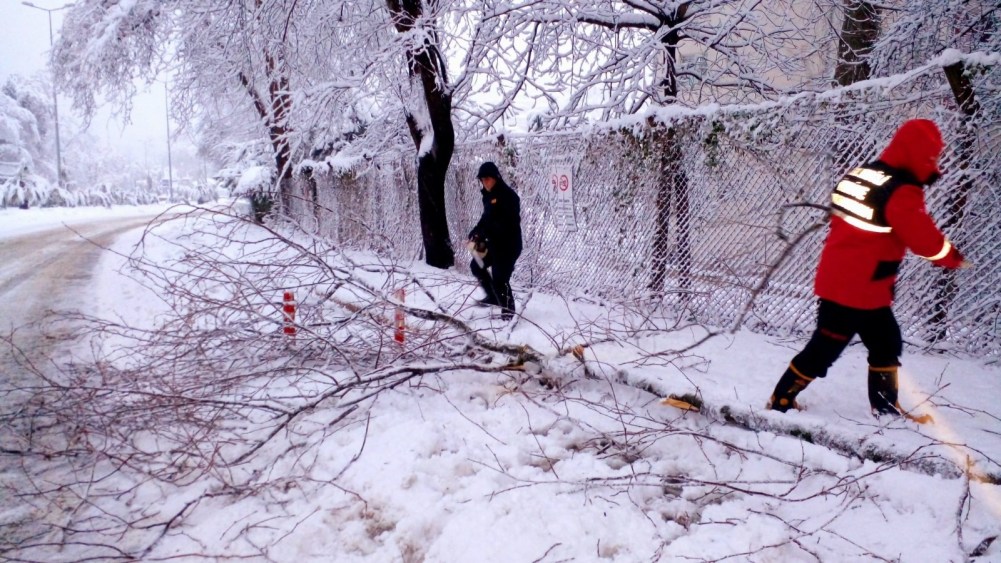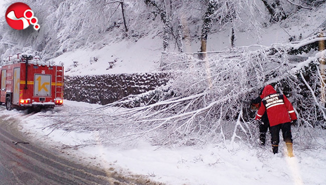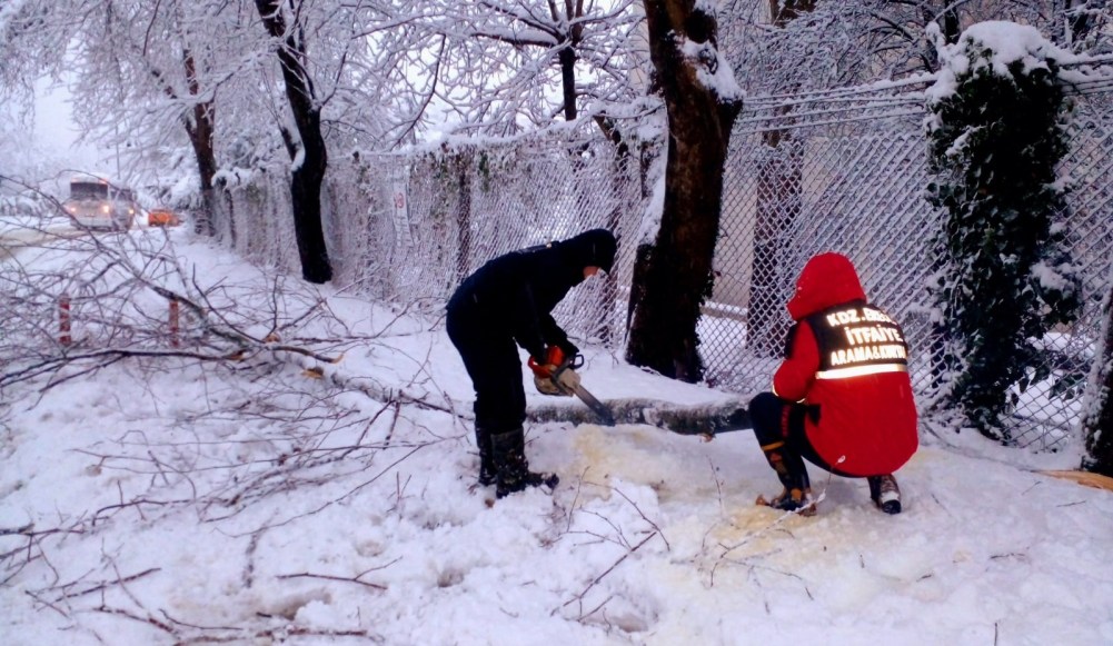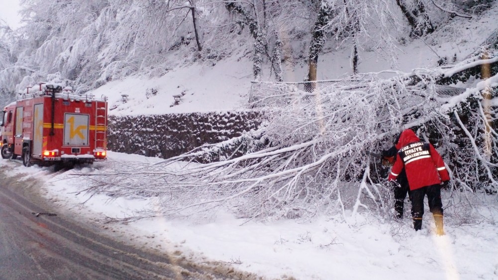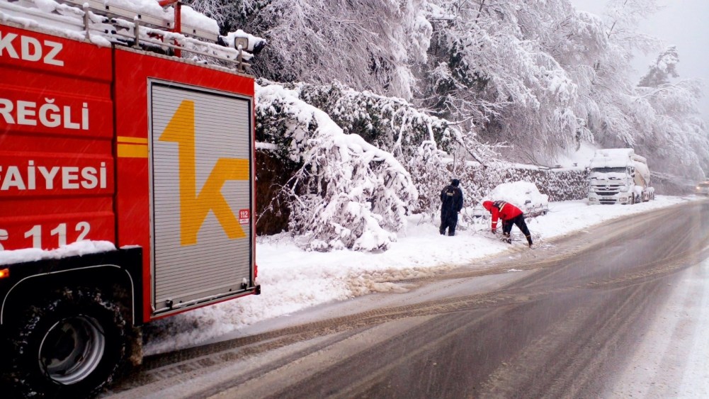 Kdz. Ereğli’de etkili olan kar yağışı sonrası bir çok ağaç devrildi, dallar kırıldı. İtfaiye ekipleri ağaç temizliği yapıyor.