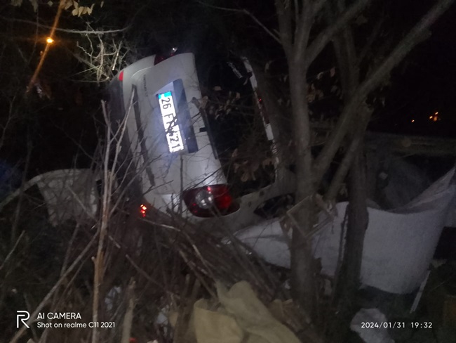 Olay; ilçeye bağlı Sarıkorkmaz Mahallesi Molla Ahmet Sokak üzerinde meydana geldi. İddiaya göre; H.Ö. idaresindeki 26 FF 421 plakalı aracı ile seyir halinde iken direksiyon hâkimiyetini kaybetmesi sonucu yoldan çıkarak ağaçlık alana uçtu. Olayı gören vatandaşlar durumu sağlık ekiplerine bildirdi. Kısa sürede olay yerine gelen sağlık ekipleri yaralı sürücü H.Ö. ve araçta yolcu olarak bulunan E.Ö.’ yü ambulansa alarak yaptıkları ilk müdahalenin ardından Devlet Hastanesine kaldırdı. Hastanede tedavisine başlanan H.Ö. ve E.Ö.’ nün hayati tehlikesi olmadığı öğrenildi.
