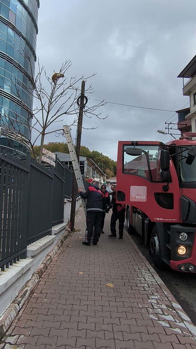 Zonguldak’ta Meşrutiyet Mahallesinde ağaçta kalan kedi itfaiye ekiplerinin yardımıyla kurtarıldı.
