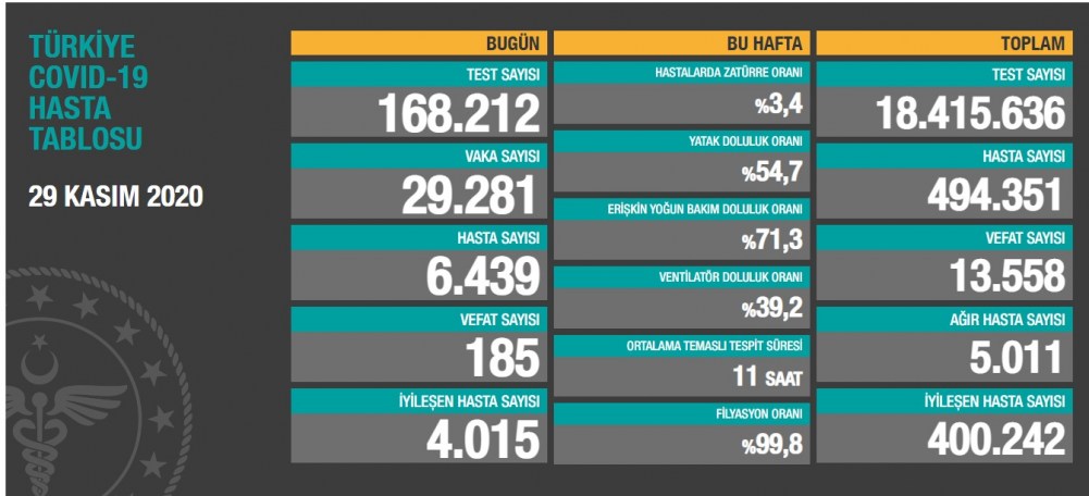 Sağlık Bakanlığı, son 24 saatte 185 kişinin korona virüsten hayatını kaybettiğini, 29 bin 281 yeni vaka sayısının olduğu açıkladı.