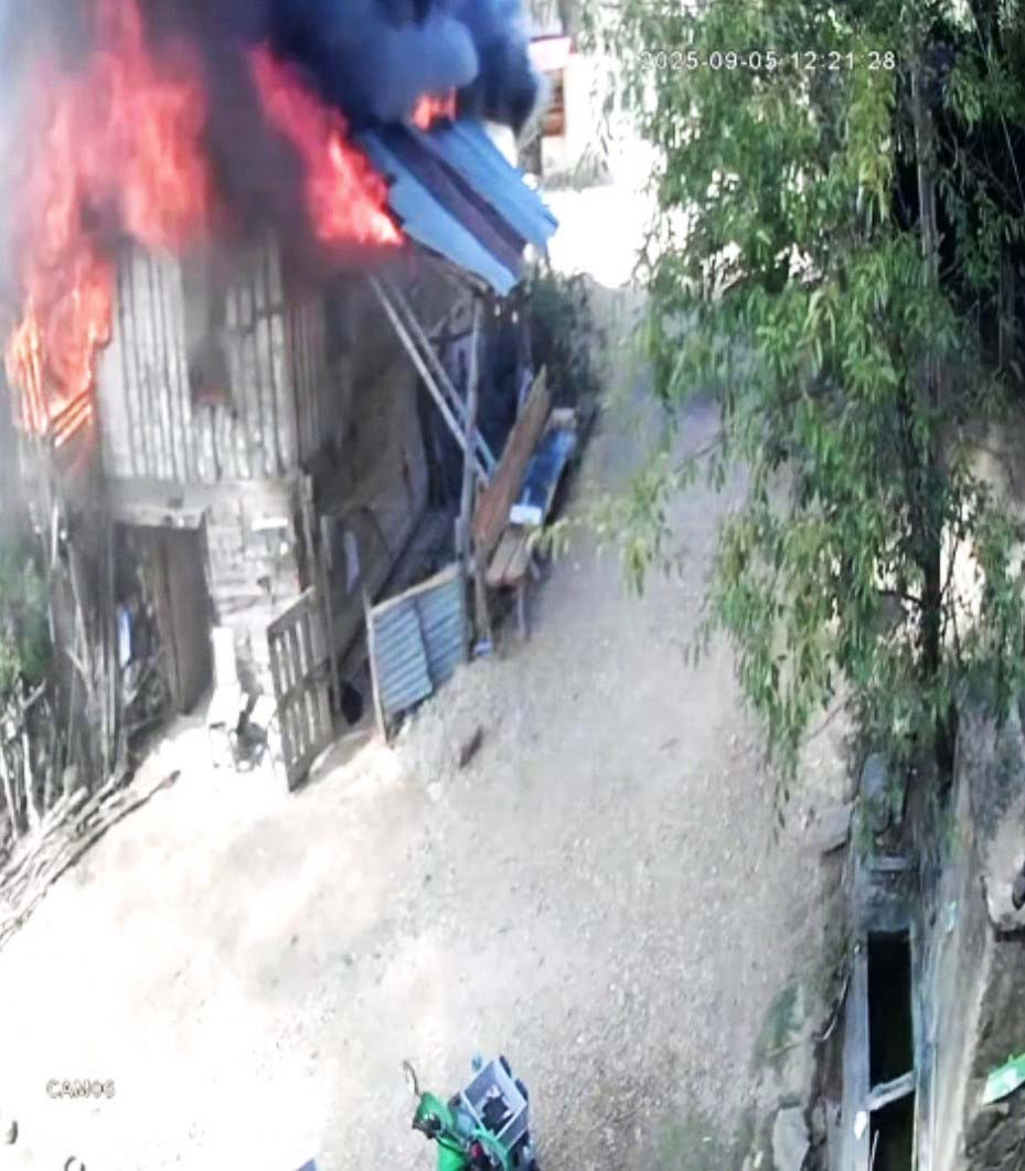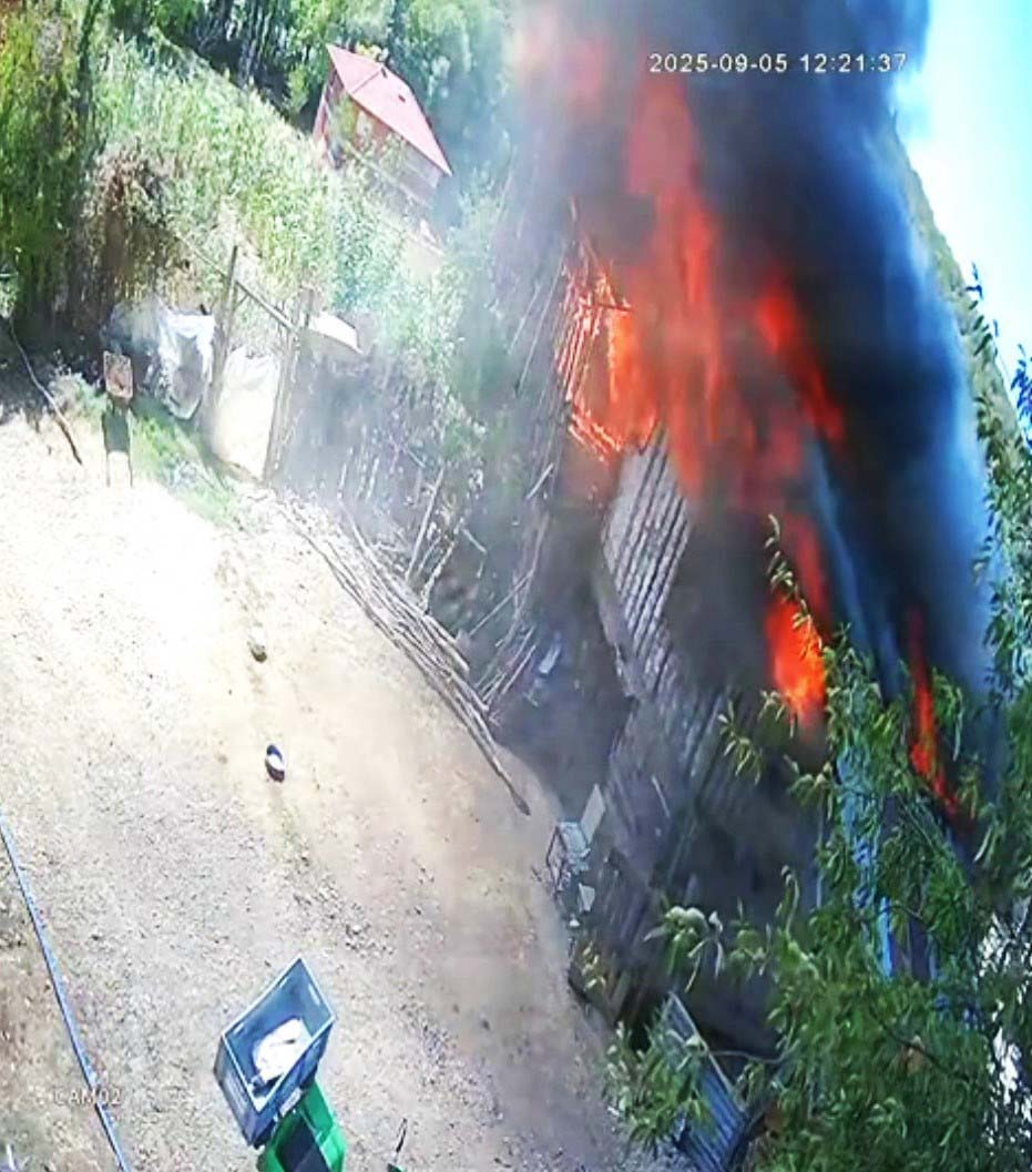 Ekiplerin hızla müdahalesiyle kontrol altına alınan yangında ev tamamen yandı. Evin alevlere teslim olduğu anlar güvenlik kamerasına yansıdı.