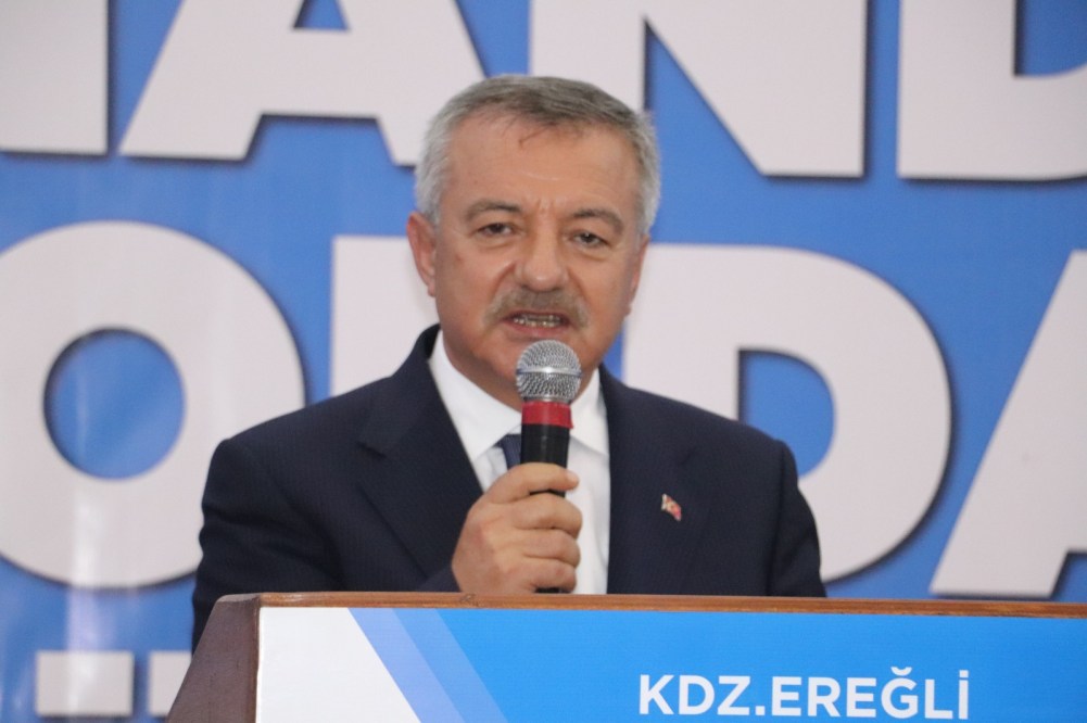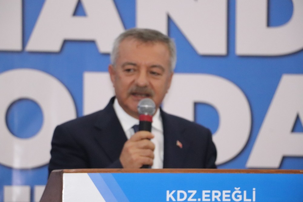 "Ereğli'mizde başta liderimiz, cumhurbaşkanımızın desteği, bakanlarımız, milletvekillerimiz, il başkanlarımız, ilçe başkanlarımızın ve tüm paydaşlarımızın çabalarıyla 25 tane okulu tamamladık, tekli öğretime geçtik. 450 Yataklı hastanemiz ve diş hastanemizle tüm bölgeye hizmet veriyoruz. Ereğli Zonguldak yolumuzu, Bayat Kavşağı ve Üçköy hemzemin geçidiyle tamamlandı, hayırlı olsun. Bunun yanında Ereğli Çaylıoğlu yolumuz, çaylıoğlu'na kadar tamamlandı. İnşallah bundan sonraki dönemde sayın milletvekillerimiz ve hükümetimizin desteğiyle kalan kısım da tamamlanacak.