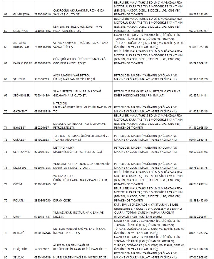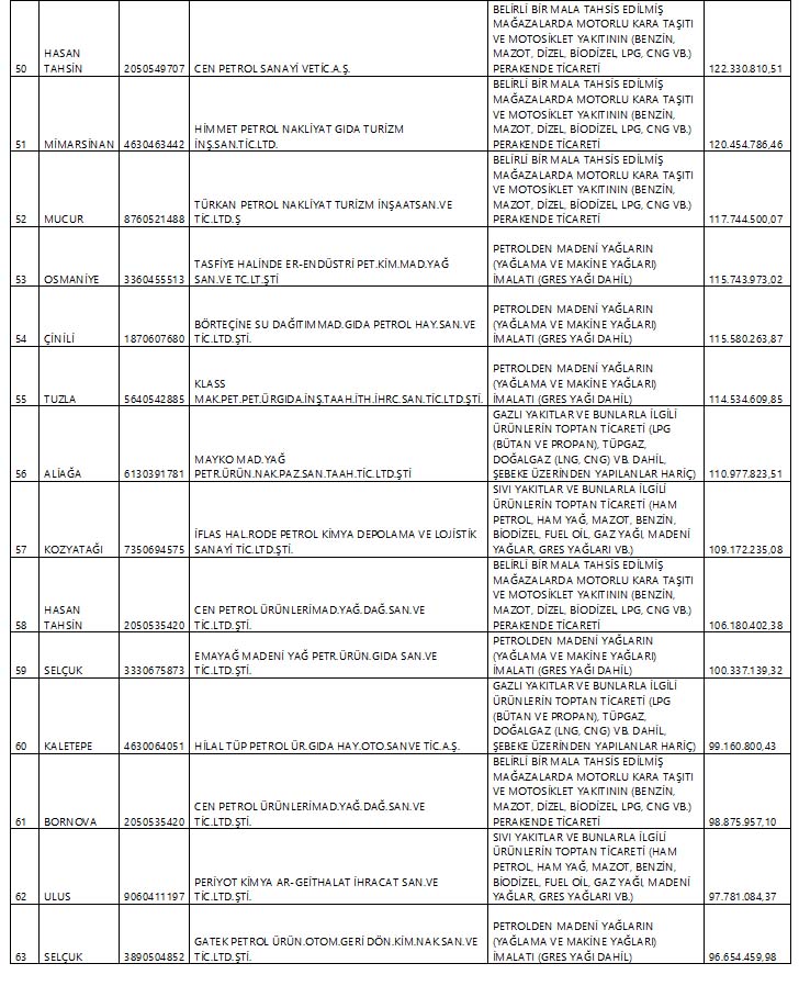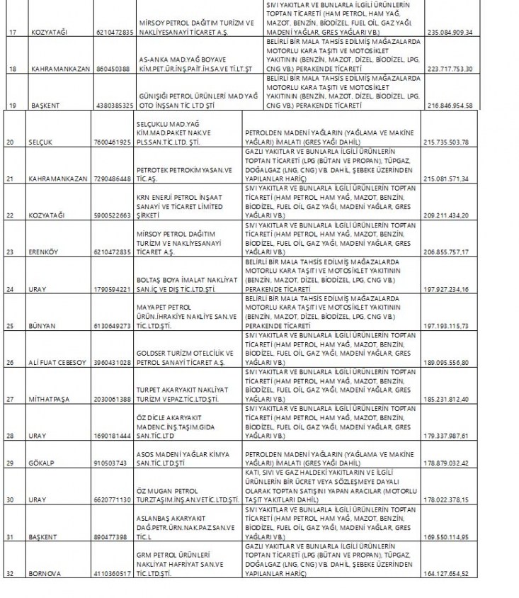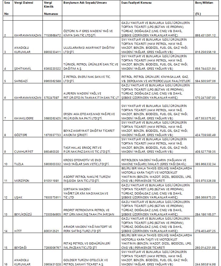 Bu çerçevede Hazine ve Maliye Bakanlığı'nın açıkladığı vergi yüzsüzleri listesinde çoğunluğu akaryakıt dağıtım şirketlerinin ve madeni yağcıların devlete ödemediği vergi tutarı 17 milyar 509 milyon 779 bin 994 liraya ulaştı.