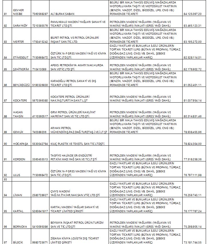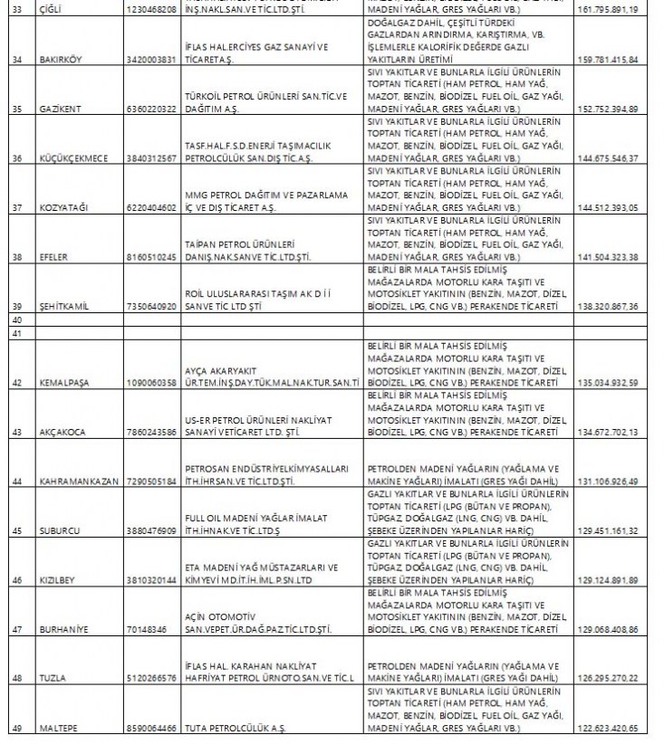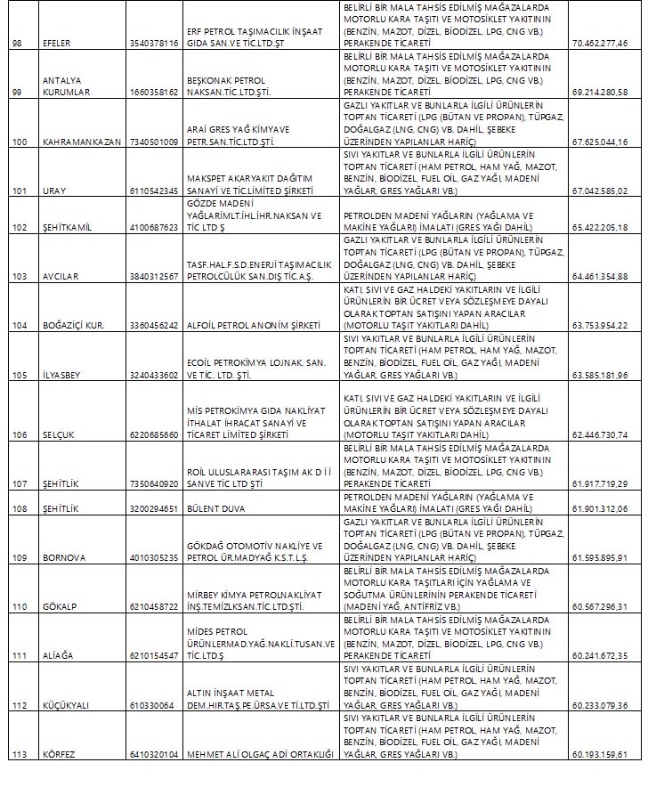 Yeni Şafak'ın haberine göre, Enerji Petrol Gaz İkmal İşverenleri Sendikası'nın (EPGİS) belirlemelerine göre Hazine ve Maliye Bakanlığı tarafından açıklanan listede, enerji, gaz, petrol sektöründe faaliyet gösteren 112 şirket yer alıyor.
