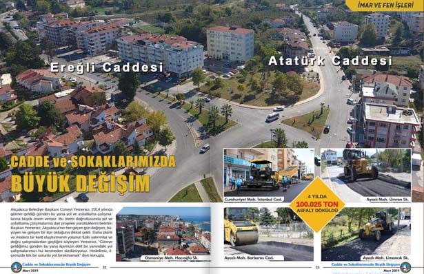 Toplam 168 sayfayı bulan dergide, Yemenici döneminde Akçakoca kent merkezinde altyapıdan, mekansal düzenlemelere kadar gerçekleştirilen projeler, çarpıcı fotoğraflarla yer alıyor.