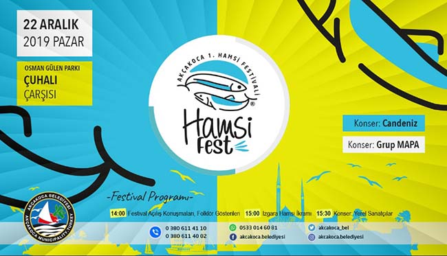 Akçakoca Hamsi Festivali, 22 Aralık Pazar günü Çuhallı Çarşısı Osman Gülen Parkı’nda gerçekleştirilecek. 14.00’da açılışı yapılacak olan hamsi festivali folklor gösterileriyle devam edecek. Izgara hamsi ikramları saat 15.00’dan itibaren yapılacak. Festivalin devamında yerel sanatçıların sahne alacağı konserler gerçekleştirilecek. Saat 15.30’da başlayacak olan konserlerde Candeniz ile Grup Mapa Karadeniz müzikleriyle sahne alacak.