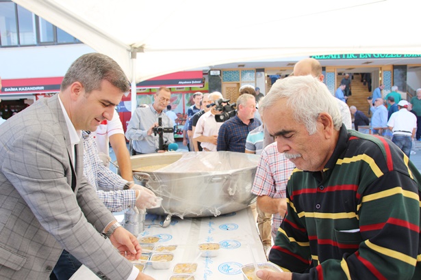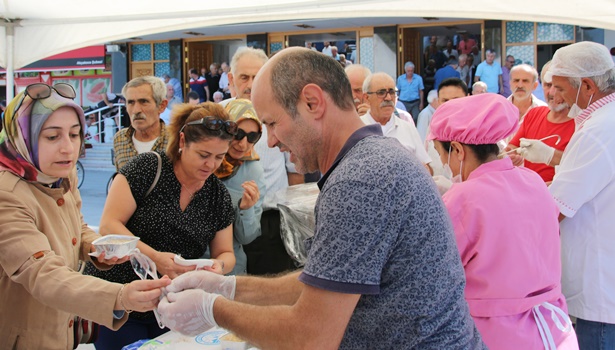 Muharrem ayı ve aşure günü nedeniyle Akçakoca Belediyesi tarafından Merkez camii önünde Cuma namazı çıkışı vatandaşlara aşure dağıtıldı.