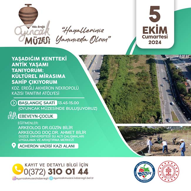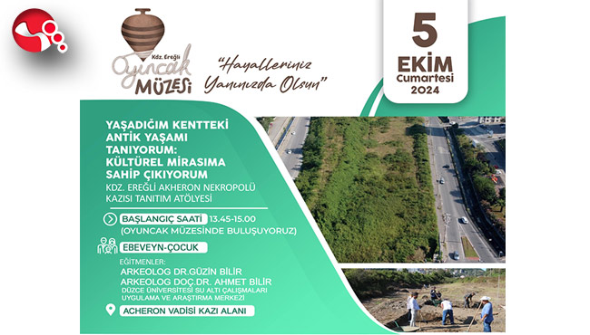 Kdz. Ereğli Belediyesi Oyuncak Müzesi tarafından ‘Yaşadığım kentteki antik yaşamı tanıyorum: Kültürel mirasıma sahip çıkıyorum’ etkinliği kapsamında Akheron vadisinde kazı tanıtım atölyesi gerçekleştirilecek.