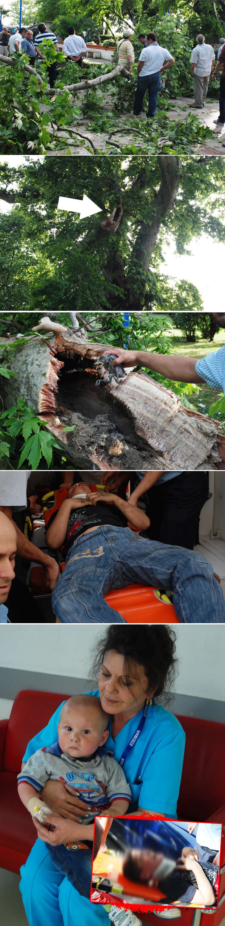 Asırlık çınar ağacının yaklaşık yarım ton ağırlığında ki parçası koptu, altındaki vatandaşların üzerine düştü. Meydana gelen akıl almaz olayda biri 12 diğeri 1,5 yaşında iki çocuk yaralandı.