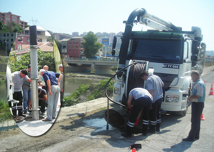 Alaplı ilçesi Fatih Mahallesinde yeni yapılan köprü civarında, köprü çalışmalarından kaynaklanan ve bulunduğu bölgede sıkıntılı bir durum yaratan Q 500 mm. çaplı kanalizasyon kolektör hattına Vactor-2100 kanal açma-temizleme aracı ve ekipler müdahalede bulunarak tıkalı hat açıldı ve akabinde hattın temizliği yapılarak oluşan olumsuz durum ortadan kaldırıldılar.