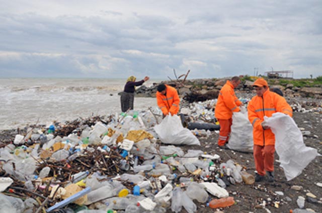 Alaplı Belediye Başkanı Dr. Nevzat Çimenoğlu, sağanak yağışla birlikte yükselen ve sahile vuran dalgaların, çoğunluğu pet şişelerden oluşan tonlarca plastik ambalaj atığını kıyıya sürüklediğini belirtti. İlçenin deniz sahilinin belli kesimlerinde pet şişe yığınları oluştuğunu hatırlatan Çimenoğlu, "Özellikle Alaplı Deresi'nin denizle buluştuğu noktaya yakın yerlerdeki deniz sahili, dalgaların sürüklediği pet şişelerle dolup taştı. Bu pet şişeleri geri dönüşüme kazandırmak, sahillerimizi temizlemek için işçilerimiz pet şişe ve plastik ambalaj atıklarını çuvallara doldurmak suretiyle toplamaya başladı. Sahillerdeki tonlarca plastik ambalaj atıklarını, diğer çöplerden ayrıştırarak toplamak suretiyle geri dönüşüm firmasına göndereceğiz." dedi.