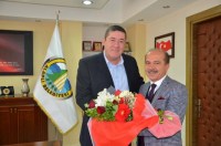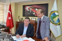 Şube Başkanı Erol Yılmaz, imza töreninden önce Belediye Başkanı Nuri Tekin'e bir buket çiçek takdim etti.