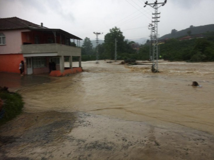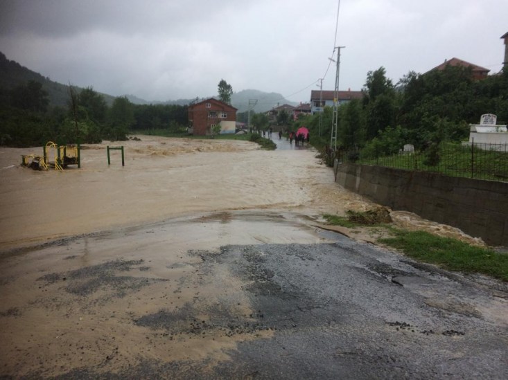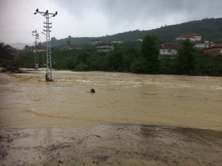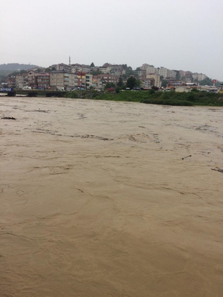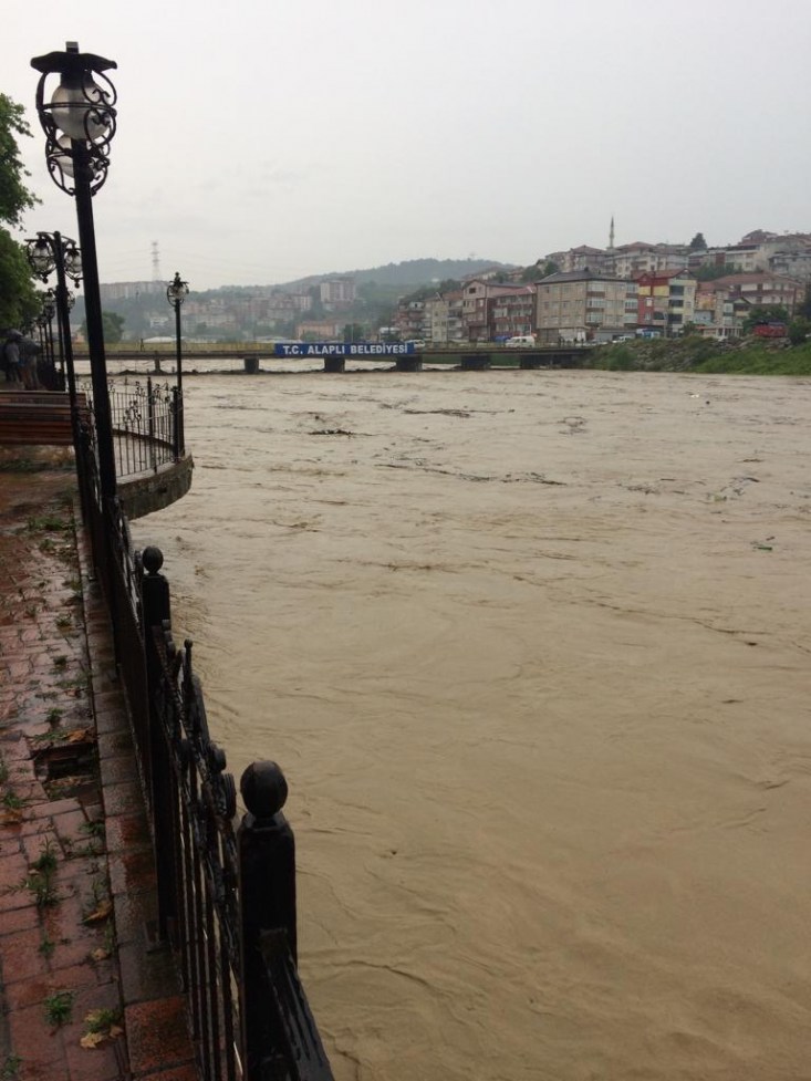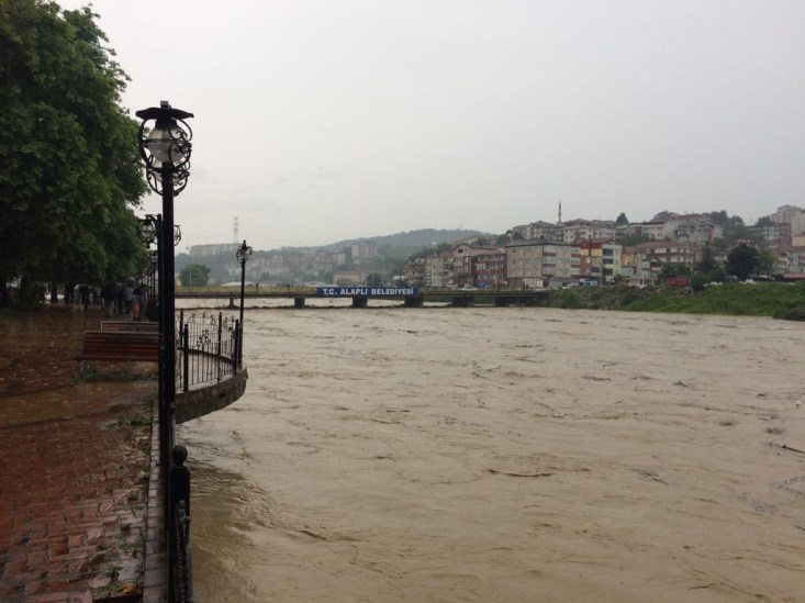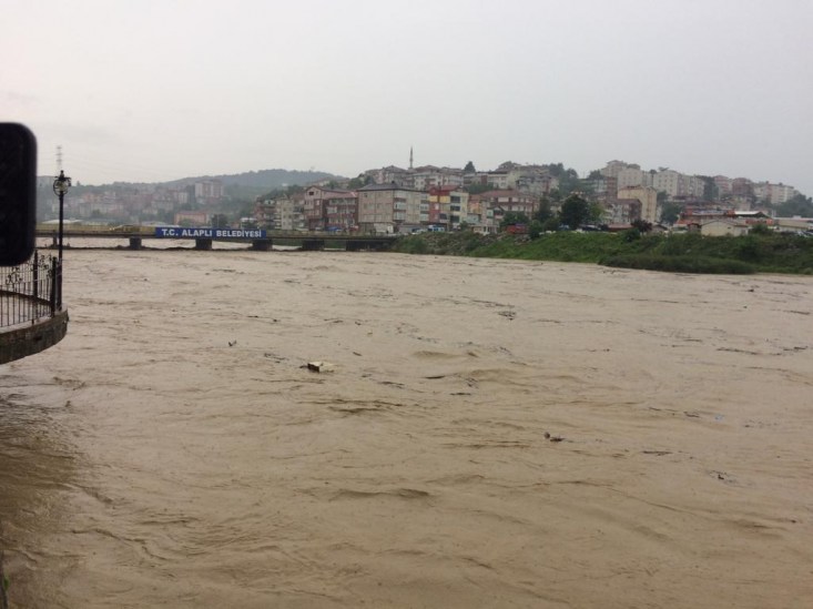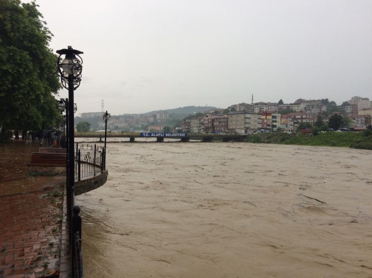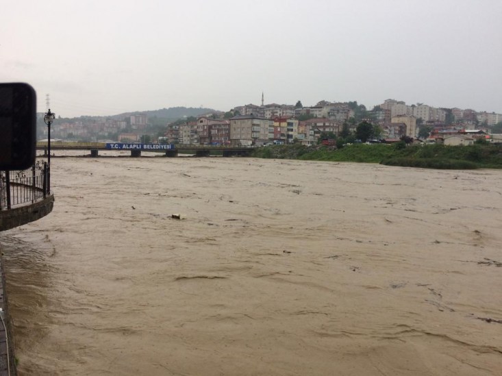 Alaplı'da aşırı yağışlar nedeniyle ilçenin ortasından geçen Çayın su seviyesinin kritik seviyeye ulaşması üzerine köprü ulaşıma kapandı. vatandaş ve esnaf, sel nöbeti tutmaya başladı.