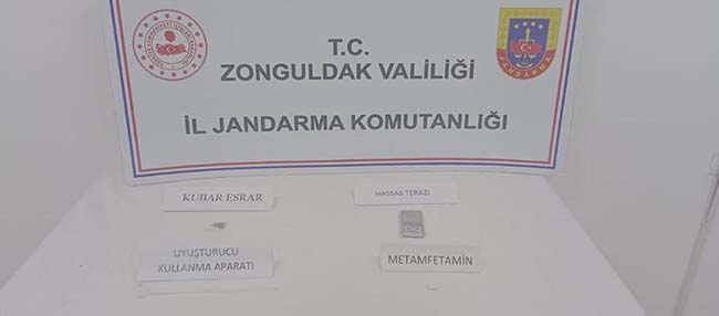 Alınan bilgiye göre, Zonguldak İl Jandarma Komutanlığı ekiplerince, 08 Ekim 2023 tarihinde, Alaplı ilçesi mülki sınırları içerisinde, Adli Makamlardan alınan arama kararına istinaden (1) araçta ve araç içerisinde bulunan (1) şahsın üzerinde ve eşyalarında yapılan aramada; (0,49) gram metamfetamin, (0,65) gram kubar esrar, (1) adet hassas terazi ve (1) adet uyuşturucu kullanma aparatı ele geçirildi.