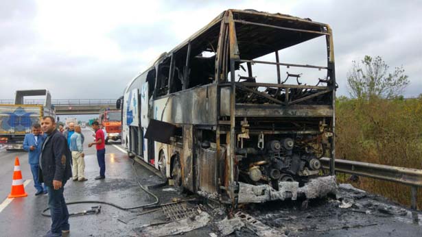 Edinilen bilgilere göre, İstanbul'dan Van'a giden Cuma G. idaresindeki 65 KC 623 plakalı yolcu otobüsü Düzce'nin Gölyaka ilçesi TEM Otoyolu Gölyaka gişeleri mevkiinde henüz bilinmeyen bir nedenden dolayı motor kısmından yanmaya başladı. Durumu fark eden sürücü otobüsü emniyet şeridine çekerek yolcuları tahliye etti.