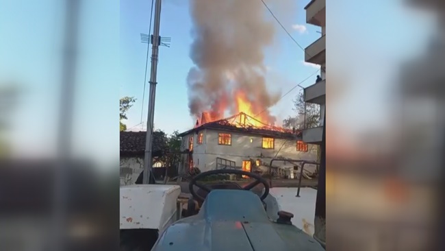 Zonguldak’ın Alaplı ilçesinde iki katlı ahşap bina alevlere teslim oldu. Yangına itfaiye ekipleri müdahale ediyor.