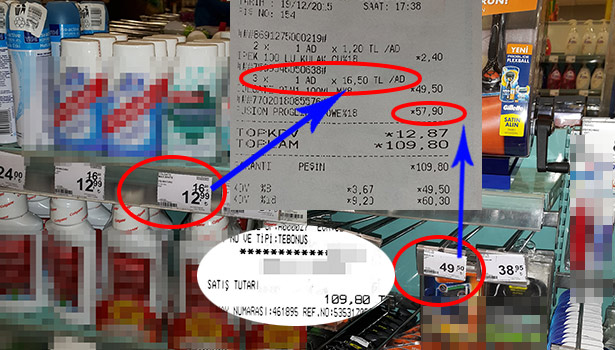 Bunun üzerine aldığı perakende satış fişi ile raf fiyatlarını karşılaştırdığını dile getiren tüketici, satış fiyatı raf üzerinde 12,99 lira olarak görünen diş macunundan 3 adet satın alıyor. Tüketici, bu alışveriş için 38 lira 97 kuruş ödemesi gerekirken, perakende satış fişinde yazan fiyat 49,50 olarak görünüyor.