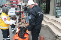 iş yerinin önüne uzanıp yatan K.H. polisin olay yerine gelmesi ile sedyeye