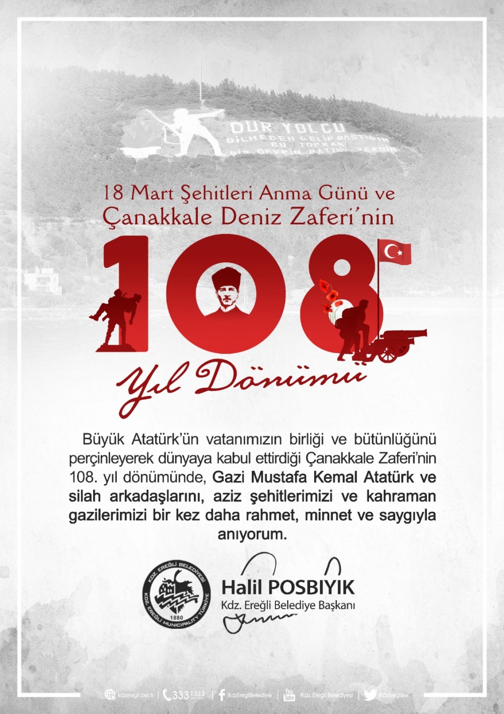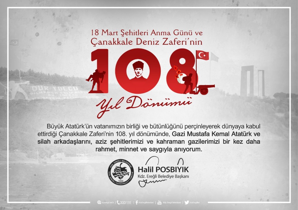 Kdz. Ereğli Belediye Başkanı Halil Posbıyık, 18 Mart Şehitleri Anma Günü ve Çanakkale Deniz Zaferi’nin 108. Yıldönümünde anma mesajı yayımladı.