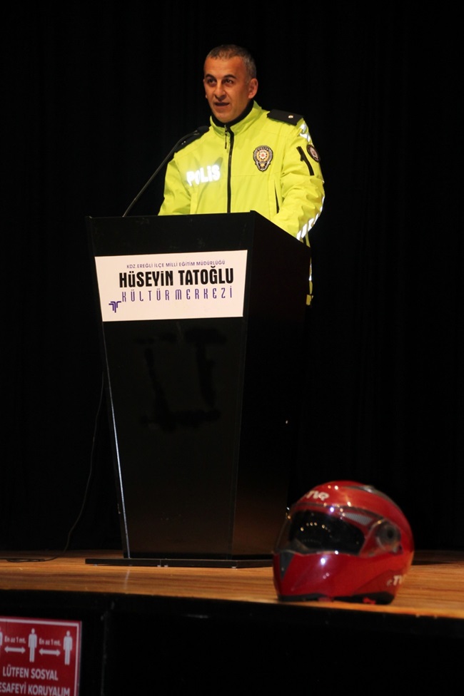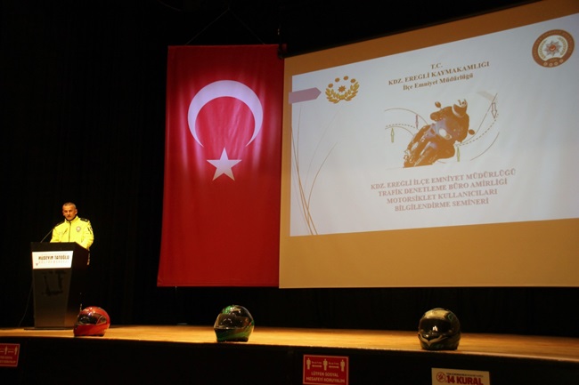 Tatoğlu Kültür Merkezi'nde gerçekleştirilen saygı duruşu ve İstiklal Marşı'nın okunması ile başlayan seminere İlçe Emniyet Müdürü Hasan Ünlü, İlçe Jandarma Komutanı Ali Akça, Trafik Polisleri, Ereğli Motosiklet Kulübü, Ereğli Bisiklet Sevenler Derneği yöneticileri ile ilçede kuryelik yapan sürücüler katıldı. İlçe Trafik Denetleme Büro Amiri Recep Öztürk, sunum eşliğinde motosiklet kullanıcılarına çeşitli bilgilendirmelerde bulundu. İlçede paket servisi hizmetlerinde kullanılan motosiklet sayısı ile günlük trafikte gözle görülür bir artış yaşandığını ve bu durum nedeniyle trafik kazalarında artış yaşandığını belirten Öztürk'ün verdiği bilgiler şu şekilde: