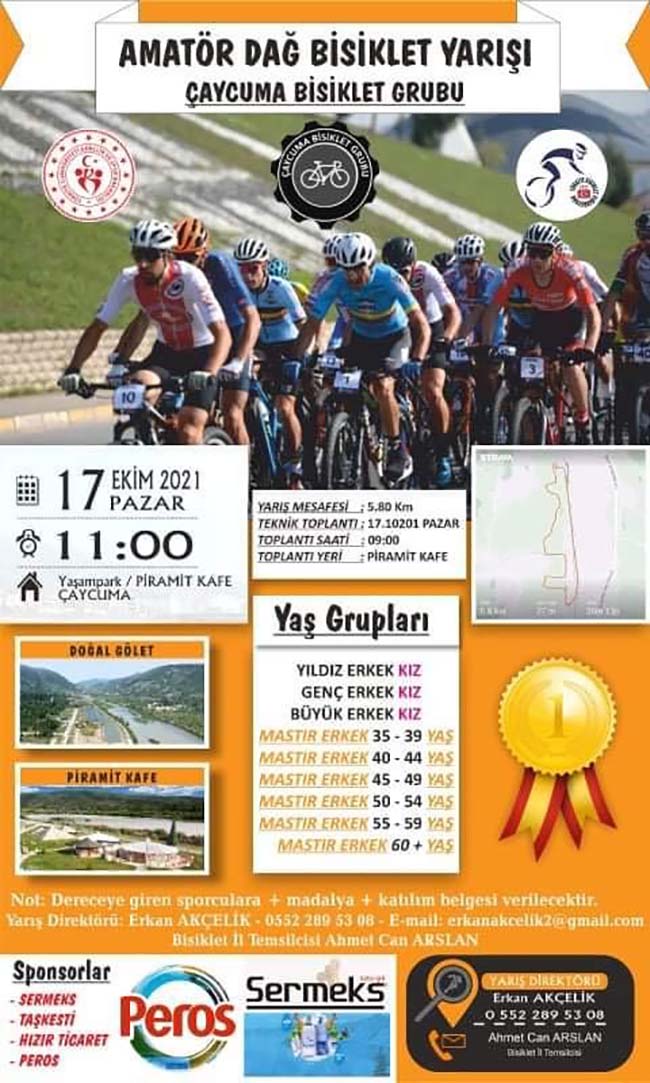17 Ekim Pazar günü düzenlenecek olan Amatör Dağ Bisiklet Yarışı saat 11.00' da Yaşam Park önünde başlayacak ve yarış mesafesi 5.80 kilometre olarak belirlendi. Organizasyon Komitesi Koordinatörü Erkan Akçelik, " Çaycuma'da amatör mücadele olarak 17 Ekim Pazar günü 'Amatör Spor Haftası' etkinlikleri kapsamında bisiklet organizasyonu yapılacak. Çaycuma Bisiklet Grubunun düzenlediği Dağ Bisiklet Yarışına Ankara Bölgesi, Kastamonu Bölgesi, Karabük Bölgesi, Zonguldak Bölgesi ve Ferdi Kulüp sporcuların katılımlarıyla gerçekleşip toplamda 100 sporcu start alacak. Organizasyona katılacak sporcuların 0552 289 53 08 irtibattan kayıt yaptırmaları gerekmektedir" dedi.