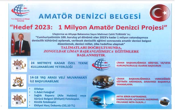Zonguldak Liman Başkanlığı'ndan yapılan açıklamada, Cumhuriyetin 100. Kuruluş yılı olan 2023'e kadar birmilyon Türkiye Cumhuriyeti vatandaşına denizcilik kültürünü aşılamak, verilecek denizcilik eğitimi sonrasında Amatör Denizci Belgesi Düzenlemek, Denizci millet, Denizci Ülke hedefine ulaşmak, insanımızın yüzünü denizlere çevirerek ufkun ötesini görmelerini sağlamak amacıyla Ulaştırma ve Altyapı Bakanlığı tarafından amatör denizcilikle ilgili temel eğitim programı başlatıldığı bildirildi.