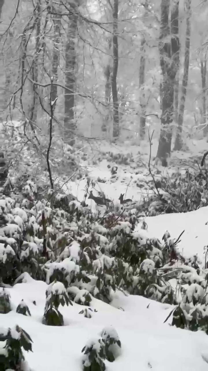 Devrek ilçesinde, kış güzelliğini görüntülemek için Göldağı mevkisine giden bir grup, ormanda gezinti yaparken iki karacayı fark etti. Doğa severler, bu özel anları cep telefonu kamerasına kaydetti.