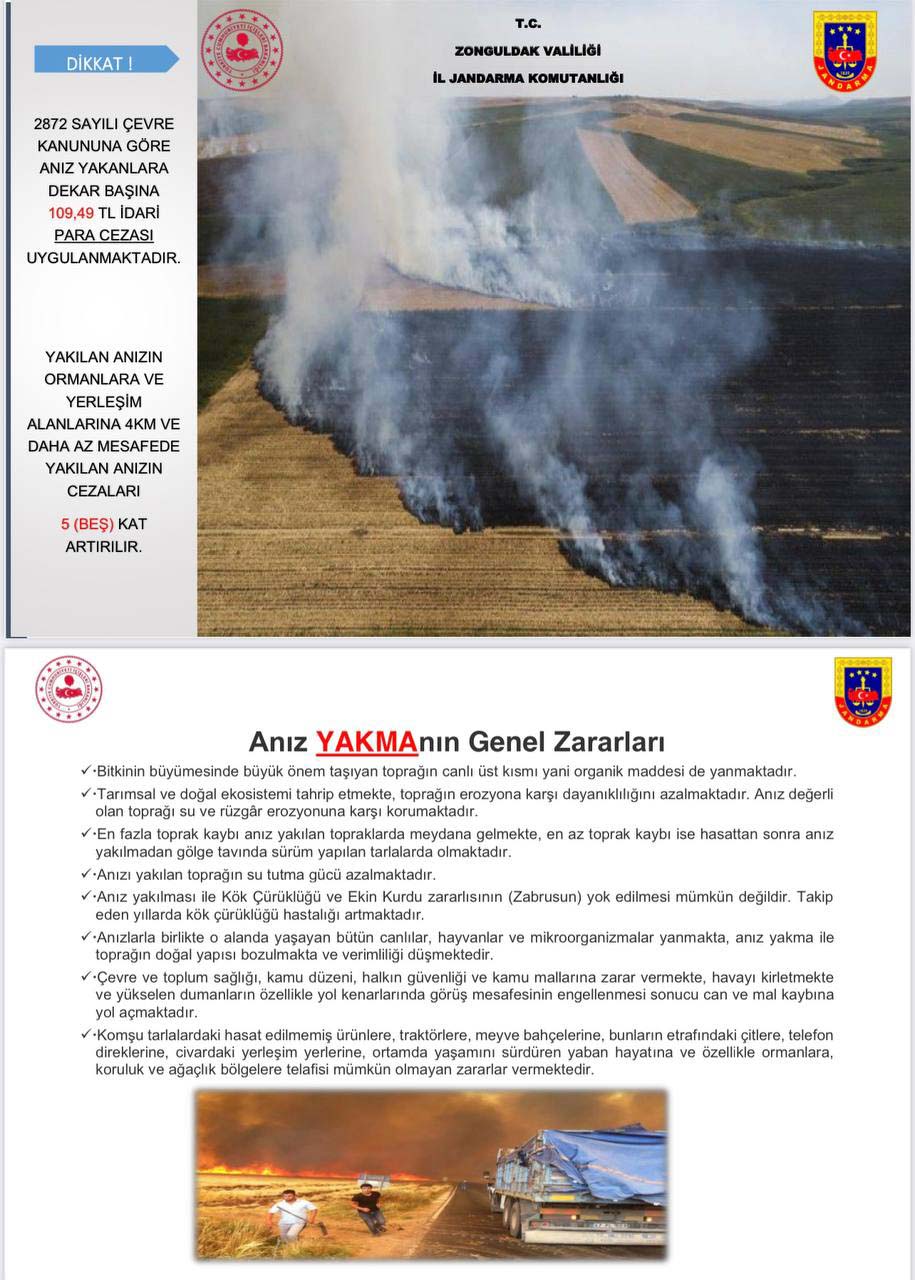“Zonguldak İl Jandarma Komutanlığına bağlı Çevre, Doğa ve Hayvanları Koruma Timince, Merkez İlçe Jandarma Komutanlığı sorumluluk alanında bulunan tarımla uğraşan çiftçilere “Anız Yakmanın Zararları” konusunda bilgilendirme yapılmıştır. Ayrıca, vatandaşların görebileceği yerlere afişler asılmış ve broşür dağıtılmıştır.” denildi