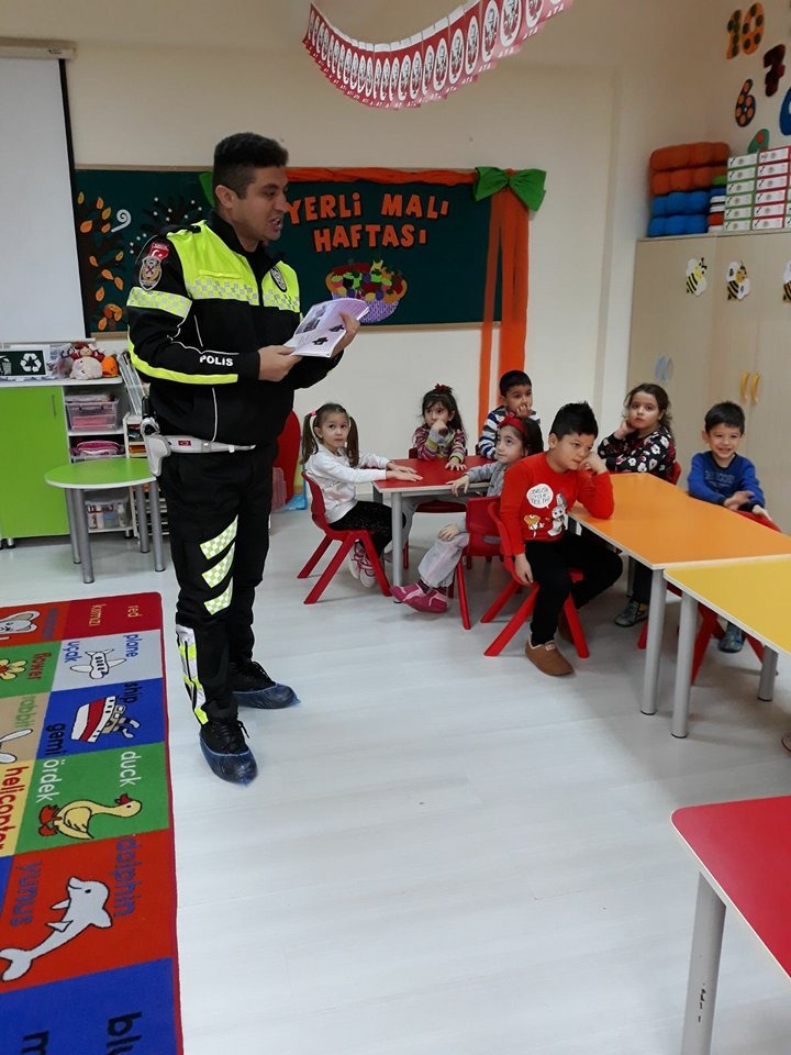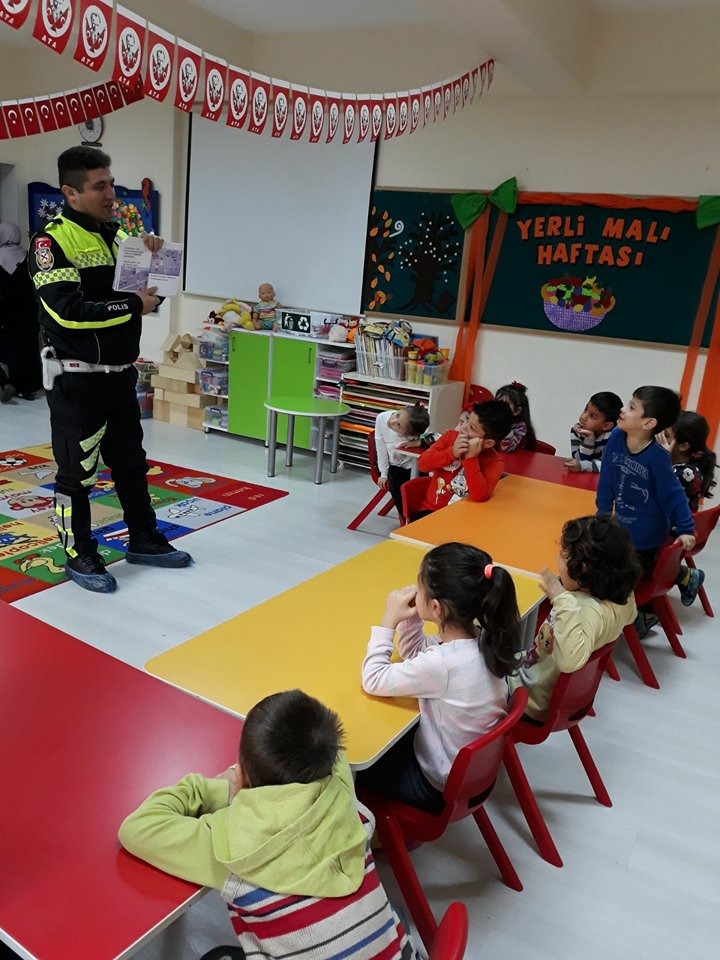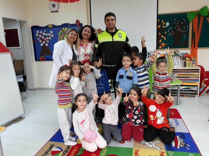 Zonguldak'ın Ereğli ilçesi Ereğli ilkokulunda anaokulu öğrencileri trafik kurallarını polis abilerinden öğrendi. Polis memuru Cem Çalışkan'ı dikkatle dinleyen öğrenciler, Çalışkan'ın sorduğu sorulara ise doğru cevaplayarak alkışı hak ettiler.