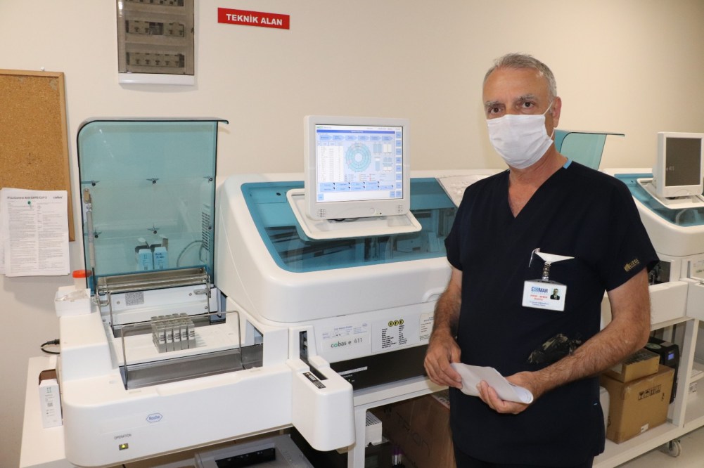 Çimenoğlu açıklamasında “Arka tarafımızda görmüş olduğunuz laboratuvarımızda kullandığımız bu cihaz Koronavirüs ile ilgili kandan hızlı testi yaptığımız cihazımız. Bilindiği üzere bu Koronavirüs Pandemisi çok hızlı şekilde yayılmakta. Laboratuvar açısından iki şekilde teşhisini koyabilmekteyiz. Birincisi boğazdan ve burundan alınan örneklerle yapılıyor. Alınan örnekler laboratuvara gönderiliyor. PCR testi dediğimiz test. Bir diğeri ise kandan baktığımız hızlı test var. Bu testle de Antikorlara bakıyoruz. PCR dediğimiz testin sonuçları en kısa 2 en uzun 5 olmakla beraber ortalama 3-4 günde çıkıyor. Ama bizim burada yaptığımız test 1 saatte sonuç veriyor. Sonuç negatif ya da pozitif olarak çıkıyor. Eğer sonuçlar pozitif çıkar ise hemen hastaya müdahale yapılıyor. Bizim hastanemizde enfeksiyon hastalıkları ya da göğüs hastalıkları ya da acil polikliniğine müracaat edildiği zaman o hastamızla ilgili Kovid hastalığı ile ilgili testi 1 saat içinde karşılaşıp karşılaşmadığınız anlaşılıyor”