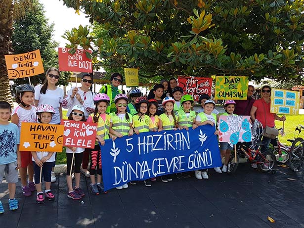 Karadeniz Ereğli İzmirlioğlu İlkokulu 3-E sınıfı öğrencileri, sınıf öğretmenleri Şadiye Turan Çakır'la birlikte yürütmüş oldukları Etwinning Projesi Çevre Polisi Projesi kapsamında bisiklet kullanımına dikkat çekmek amacıyla 5 Haziran Salı günü Ereğli sahilindeki bisiklet yolunda Dünya Çevre Günü'nü kutladılar.