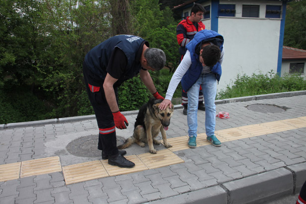 Köpeği yaklaşık 30 metre sürükleyen sürücü, köpeğin ön sol lastikte sıkıştığını görünce polise haber verdi. Polis ile birlikte olay yerine gelen itfaiye ekipleri aracı kriko ile kaldırarak köpeği kurtardı. Ayağı sekerek yürümeye başlayan köpek için belediye veteriner işleri müdürlüğü ekiplerine haber verildi. Ekiplerin beklendiği sırada mahalleli kadınlar köpeği sevemeye çalıştı. Olay yerine gelen belediye veteriner işleri müdürlüğü ekipleri, yaralı köpeği araca koyarak tedavisi için kliniğe götürdü. Köpeğe çarpan minibüs sürücüsü Yıldıray Gündoğdu ise aracına binerek kaza yerinden ayrıldı.