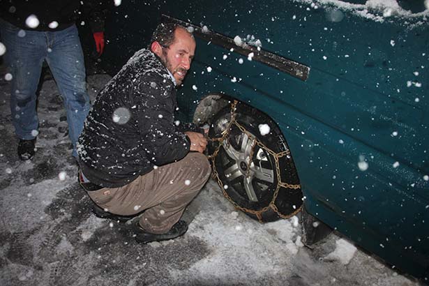Bazı araç sürücüleri ise zincir takarak yoluna devam etmek istedi. Karadenizli iki arkadaş takmasını bilmedikleri zinciri lastiğe takmak için çaba gösterdi. Trafik ekipleri kar lastiği olmayan araç sürücülerinizincirleri olmasına rağmen geçişine izin vermedi.