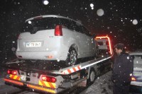 Yol kenarına çekip çekici bekleyen araç sürücüleri ve yolcuları ise çekici üzerinde arabalarının içinde oturarak yollarına devam etti.