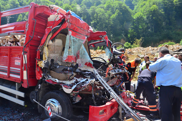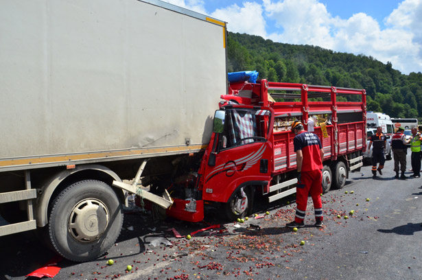 Zonguldak'ta meyve yüklü kamyon hızını alamayarak, karayolunda çalışma yapıldığı için durdurulan TIR'a arkadan çarptı. Hurdaya dönen araçta sıkışan kamyon şoförü olay yerinde hayatını kaybetti.