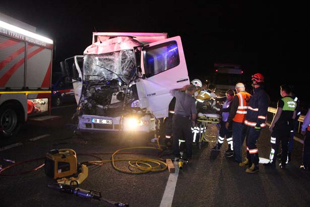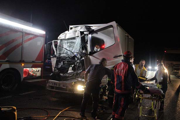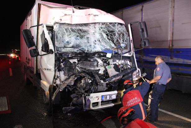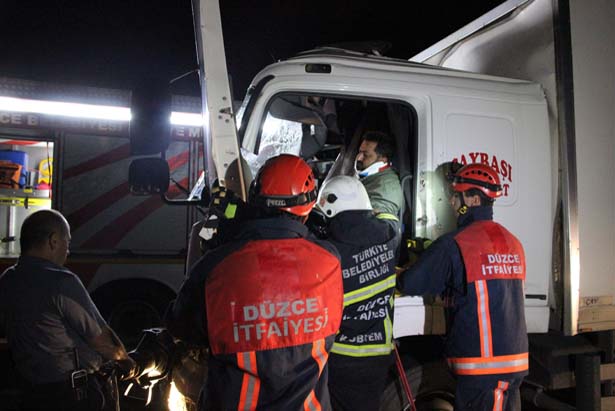 trafik kamyon kamyona arkadan çarptı. Sürücü kabininde sıkışan sürücüyü Düzce