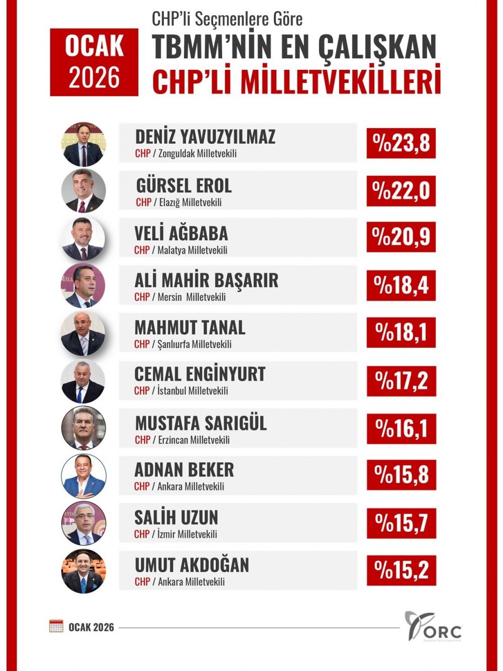 ORC Araştırma Şirketi’nin 2026 yılı Ocak ayında gerçekleştirdiği “TBMM’nin En Çalışkan CHP Milletvekilleri” araştırmasının sonuçları açıklandı.