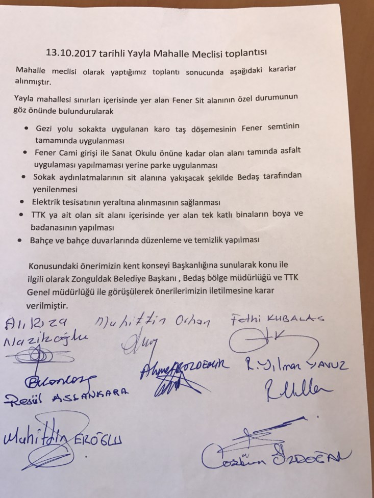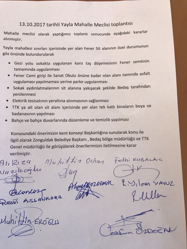 Yapılan toplantı sonrası imza altına alınan kararlarda, Yayla mahallesinde asfalt değil, parke yol yapımı özellikle Fener Sit alanı bölgesinde önemle talep edildi.