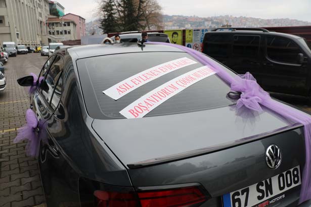 Zonguldak'ta maden işçisi Serkan Tepebaşı, boşanma davasına "Asıl evlenen evde kalır boşanıyorum, çok mutluyum" yazdığı aracıyla geldi. İki çocuk babası olan maden işçisi, tek celsede anlaşmalı boşandı. Çocuklarının velayetini de alan baba Tepebaşı, duruşma sonrası aracıyla tek başına gezdi, müzik eşliğinde oynadı.