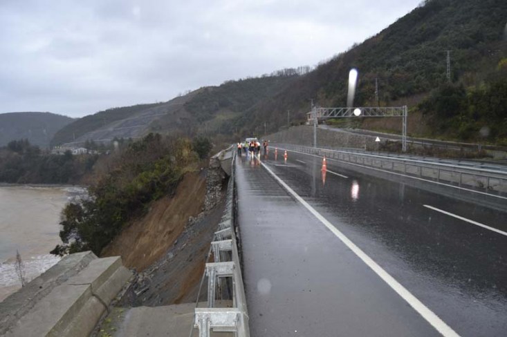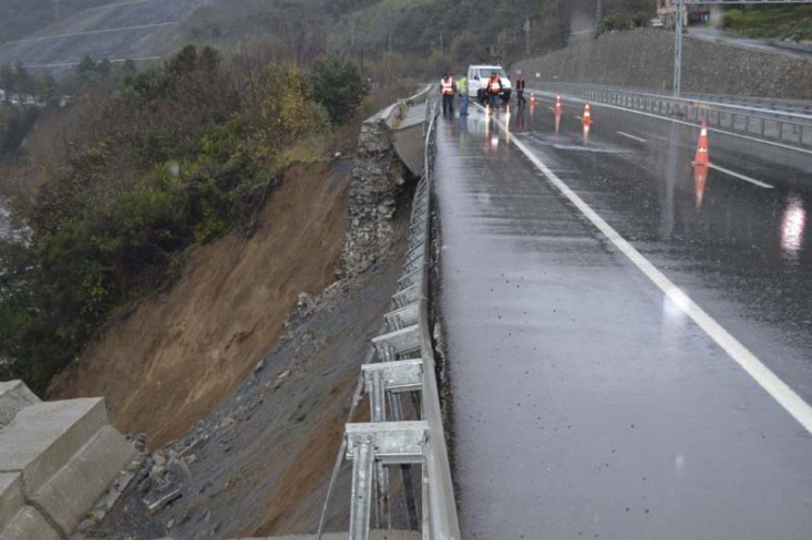 Zonguldak'ın Alaplı ilçesinde aşırı yağışlar nedeniyle Akçakoca Alaplı Karayolunda çökmeler meydana geldi. Trafik tek şeritten sağlanıyor.