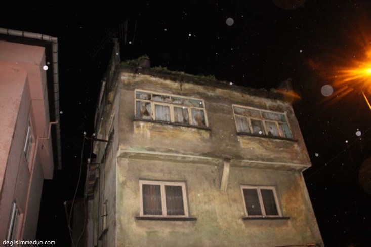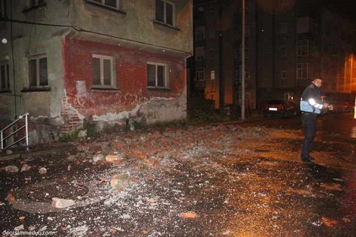 katlı metruk binanın çatı parçaları, yoğun yağış nedeniyle ana yola düştü.